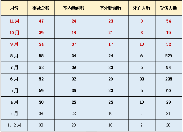 相关伤亡情况为:造成3人死亡、54人受伤。47起事故中,室内燃气事故新闻24起,室外燃气事故新闻23起。